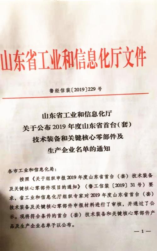 公司纳入山东省首台套生产企业名单